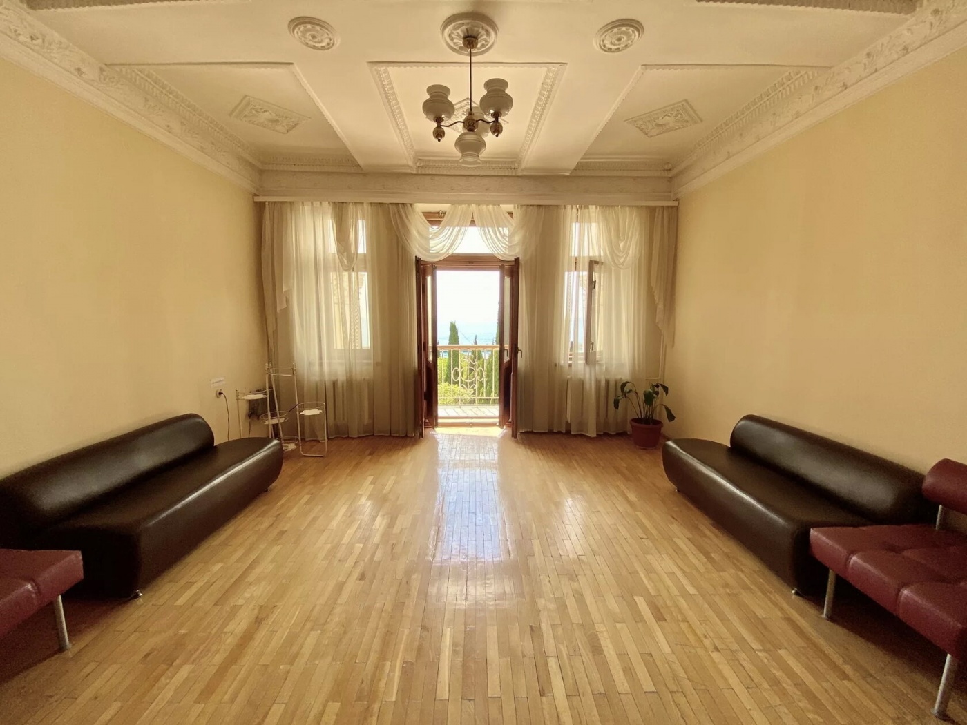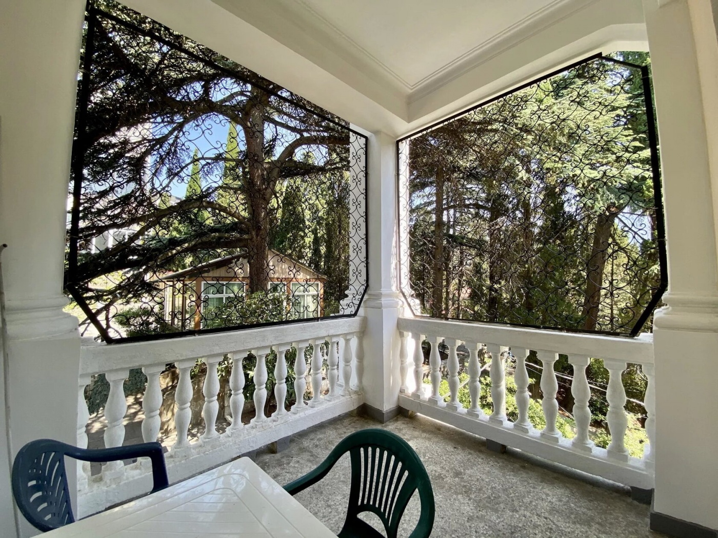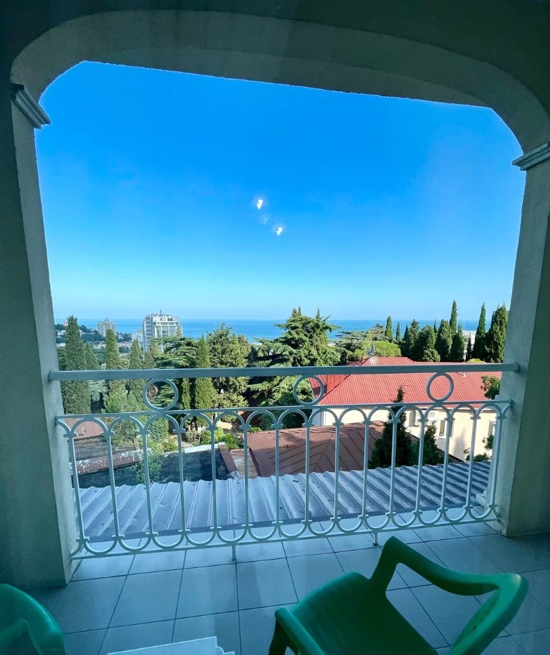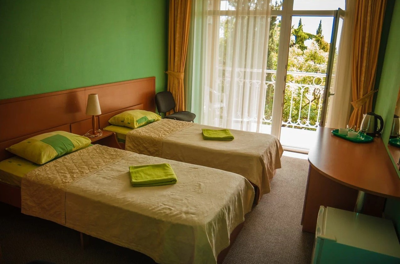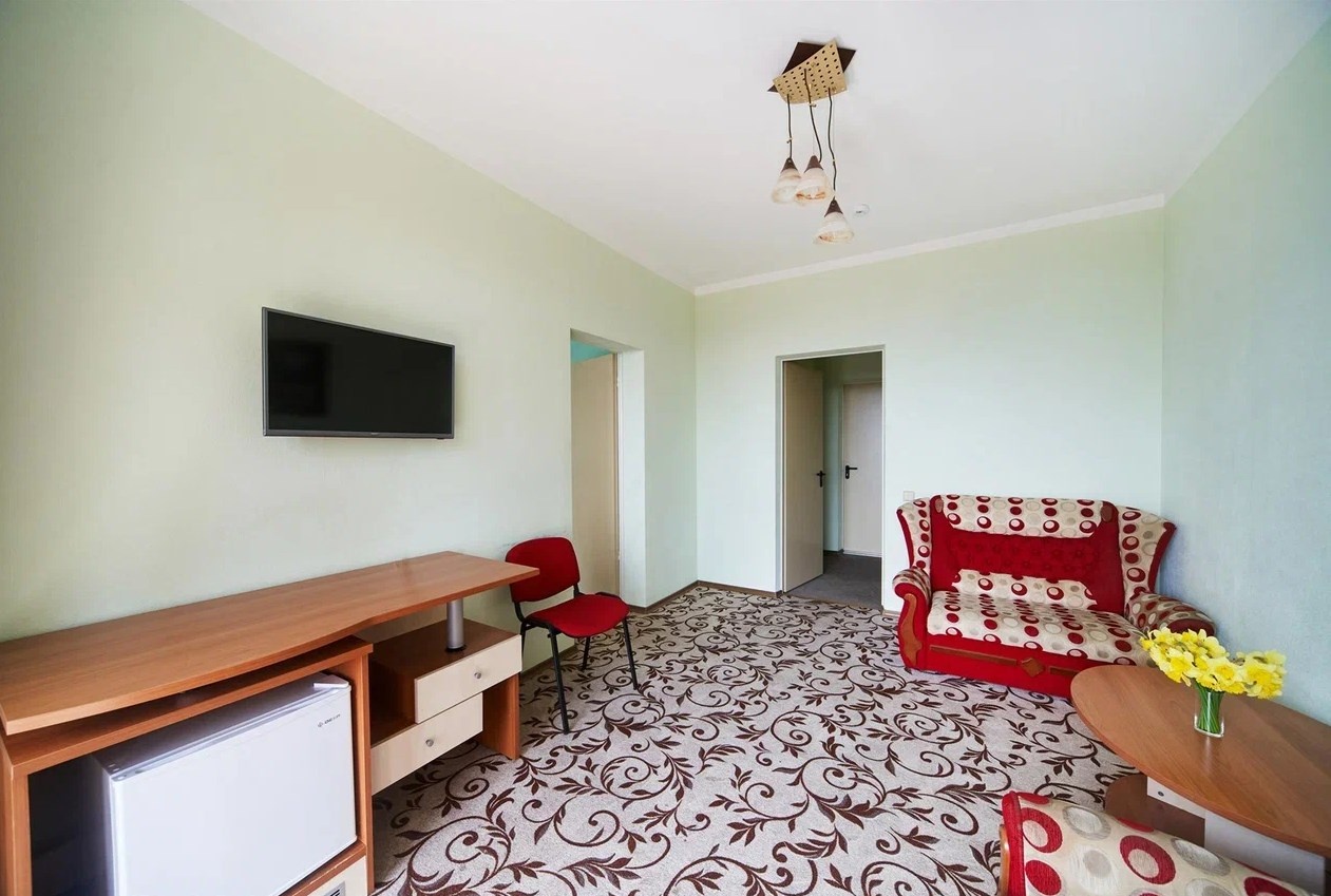 Двухкомнатный номер на втором или третьем этаже с видовым балконом. В спальне две односпальные кровати с возможностью совмещения, в гостиной раскладной диван. Удобства с душем.