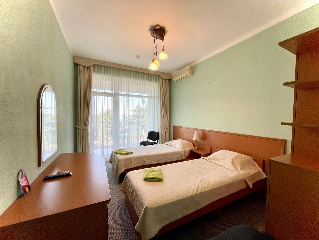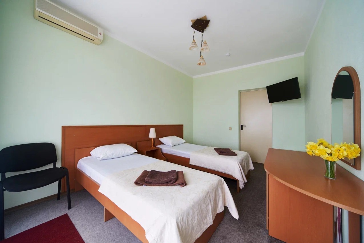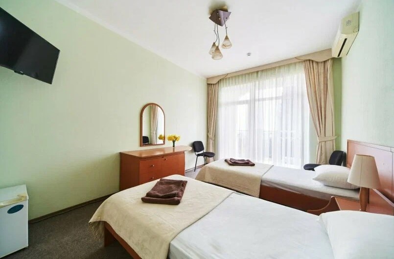 Уютный двухместный номер с максимальной вместимостью трех человек, с кондиционером, холодильником, шикарным видом на море. Питание на шведской линии можно заказать отдельно. Посещение крытого бассейна и банного комплекса по цене со скидкой 25% в соседнем отеле, и вся курортная инфраструктура в пешей доступности.